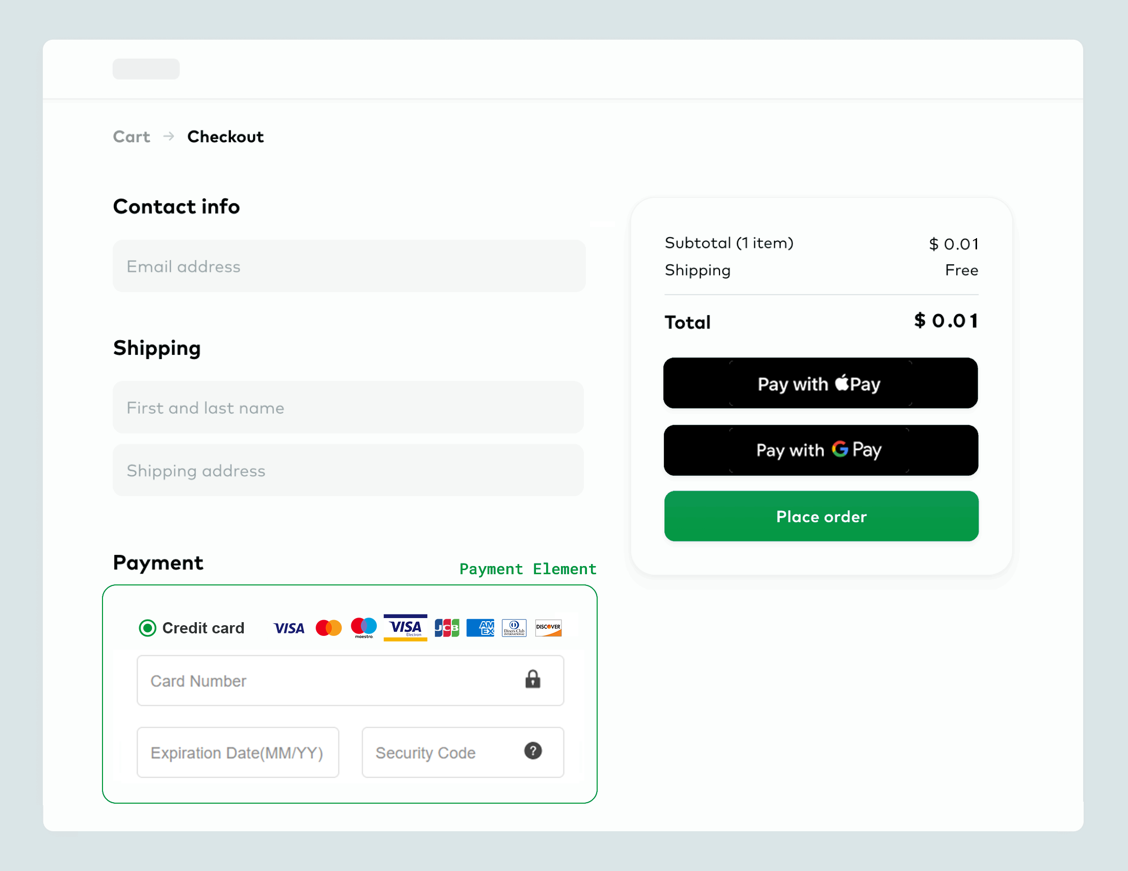 嵌入式集成方案只支持信用卡,GooglePay,ApplePay支付方式。