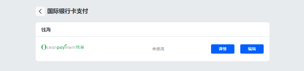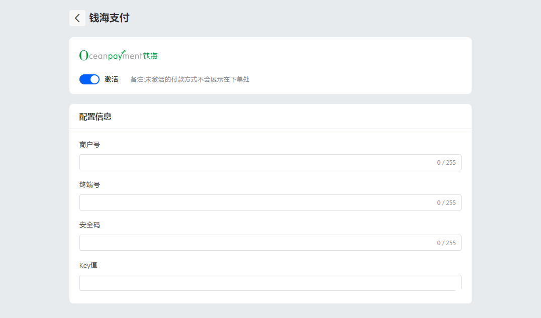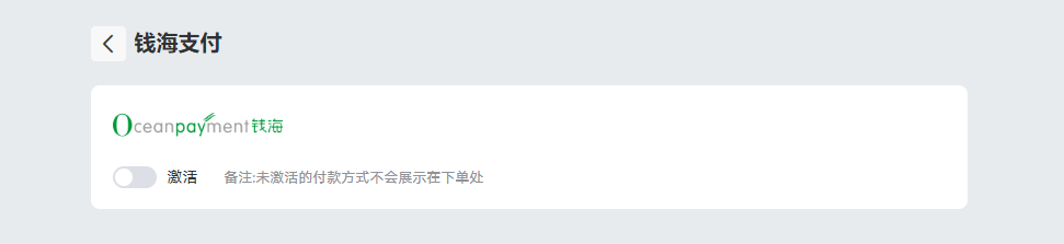 与SAAS平台集成安装指引2Cshop💳️信用卡(直连)本页总览 安装 登陆2cShop店铺后台,访问【设置】-【收款】-【国际信用卡支付】-选择Oceanpayment,点击编辑。 配置信息 填写Oceanpayment提供的配置信息,商户号(account)、终端号(terminal)、安全码(secureCode)、Key值。 支持卡种 勾选支持的卡种logo,没有申请的卡种不需要勾选。 卸载 找到信用卡支付方式,取消激活。