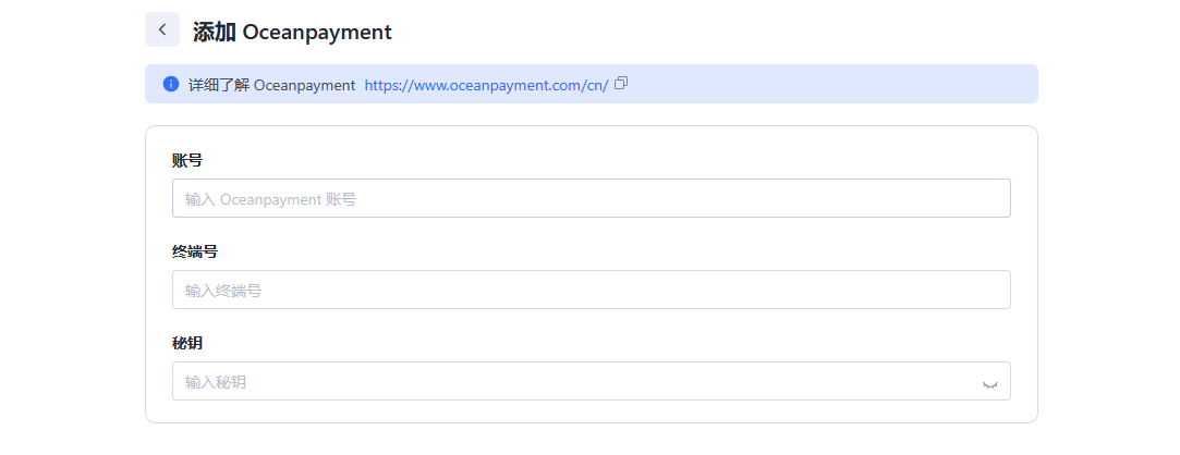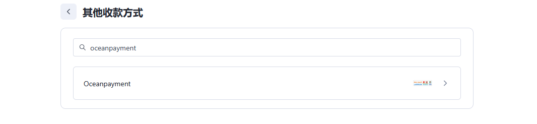 与SAAS平台集成安装指引Shopline日本便利店本页总览 安装 登陆Shoplline店铺后台,访问【设置】-【收款】-【其他收款方式】-【添加】,搜索:Oceanpayment,点击启用。 配置信息 填写Oceanpayment提供的配置信息,账号(account)、终端号(terminal)、秘钥(secureCode)。 支付logo 勾选便利店支付logo。 卸载 找到Oceanpayment日本便利店支付方式,点击停用。