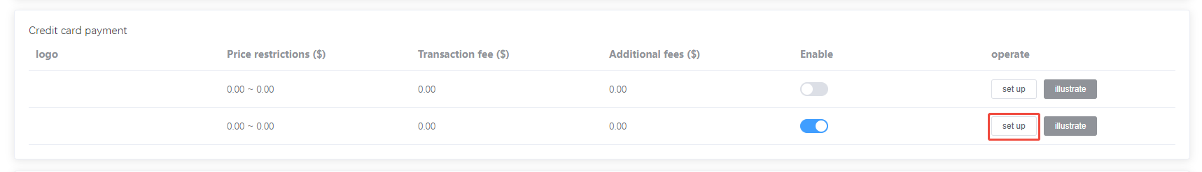 - Log in to the Shopaimi store backend (https://www.shopaimi.com/manage/login), go to Set Up Payments - Credit Card Payments, select Oceanpayment credit card, and Set Up.