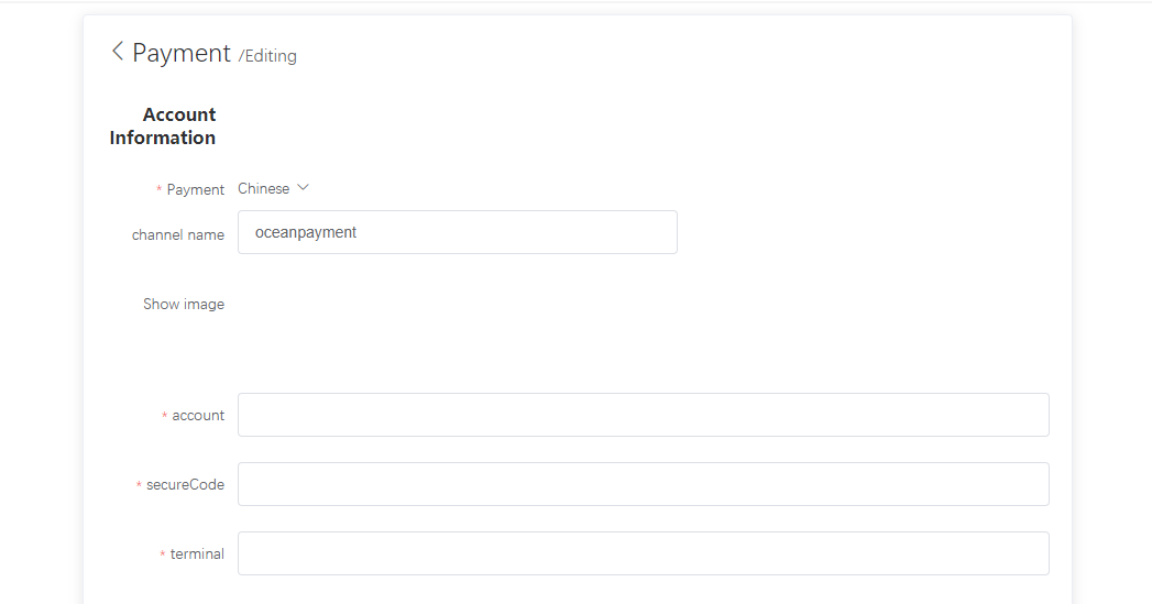 - Fill in the configuration information provided by Oceanpayment: account, terminal, and secureCode.