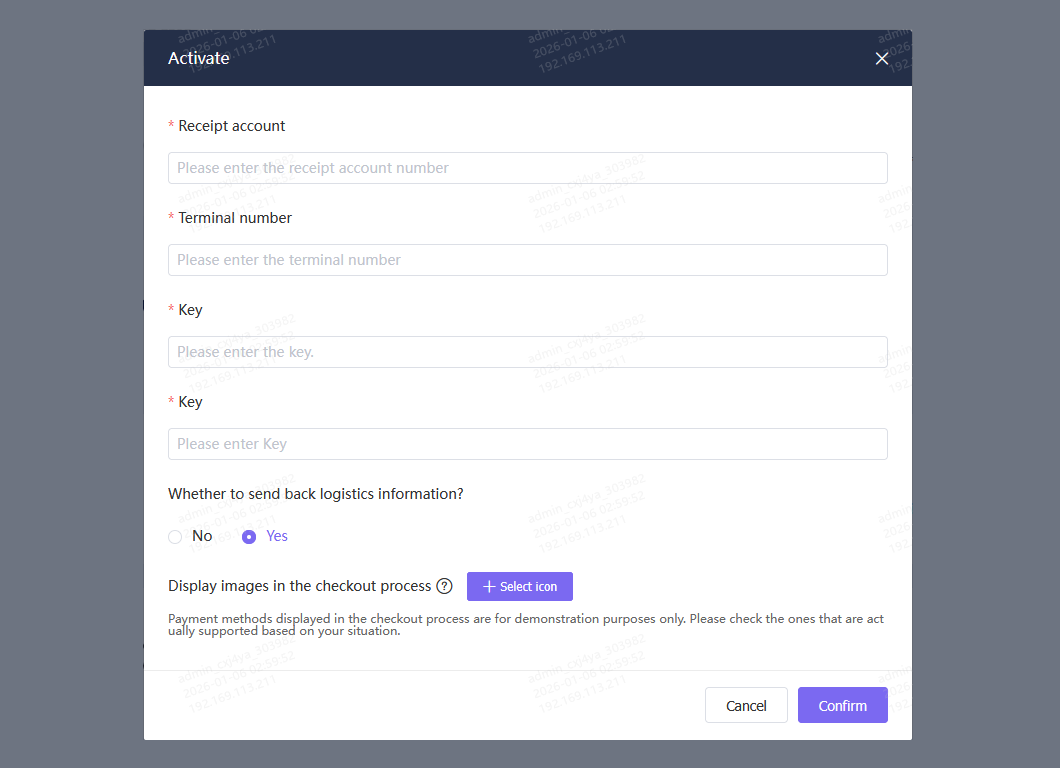 - Fill in the configuration information provided by Oceanpayment: account, terminal, secureCode, and Key.