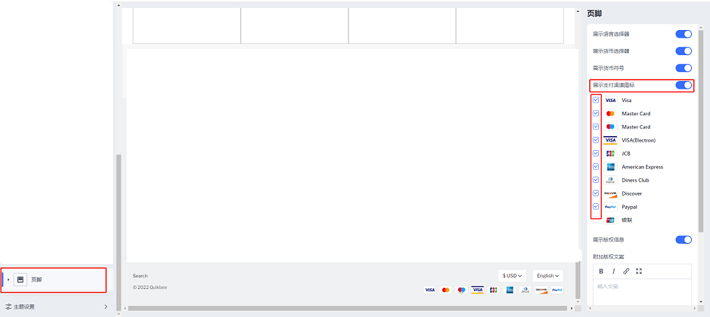 - In the store's backend menu, select 【Online Store】-【Store Design】-【Footer】-【Show Payment Channel Icons】.